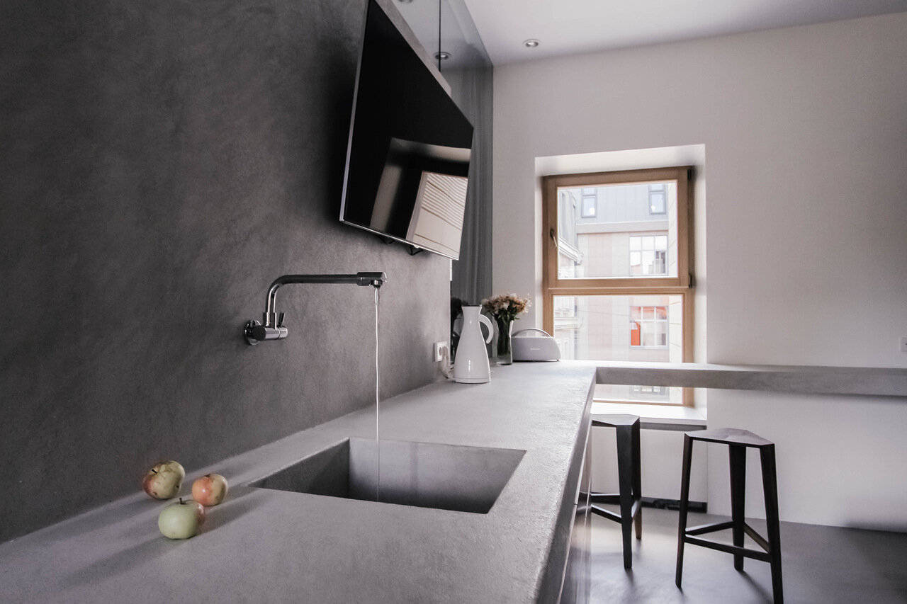 A mikrocement tökéletes választás konyhai felületek burkolására, legyen szó munkapultokról, hátfalakról vagy akár a teljes konyhai padlóról. Egyedi megjelenése és vízálló, könnyen tisztítható felülete miatt ideális modern, minimalista enteriőrökhöz is.